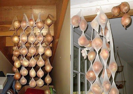 Ткань, из которой сделаны колготки, позволяет воздуху свободно проходить сквозь них. Поместите овощи - лук и картофель - в колготки, завяжите узел и повесьте на стену в хорошо вентилируемом месте.