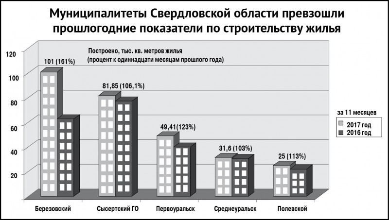 Города-спутники Екатеринбурга за 11 месяцев сдали больше жилья, чем в прошлом году. По данным областного минстроя, за 11 месяцев 2017 года в Свердловской области возведено 1,6 миллиона квадратных метров жилья. По данным за январь-ноябрь более половины муниципалитетов превзошли прошлогодние показатели. Среди рекордсменов - Березовский, Сысертский городской округ, Первоуральск, Среднеуральск, Полевской.