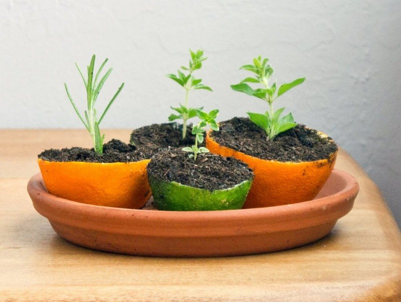 Если вы любите апельсины, грейпфруты, лимоны, помело и другие цитрусовые, то половинки их кожуры – отличная емкость для рассады. Разрежьте фрукт пополам. При помощи ложки выберите мякоть, которая пойдет в пищу. Затем в донышке половинки кожуры сделайте небольшое отверстие для оттока влаги, заполните кожуру грунтом для рассады и посейте по 1-2 семени в зависимости от величины будущего растения и размеров кожуры цитрусового. Саженец можно будет высадить с открытый грунт прямо с «горшочком».