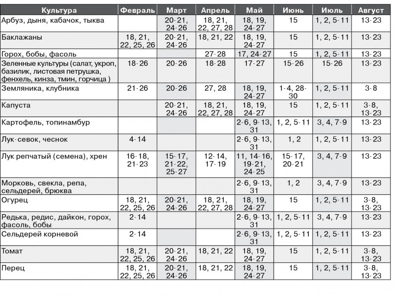 Томаты для теплицы сеем февраля до середины марта. А для открытого грунта с марта до апреля. Перцы и баклажаны – с февраля до середины марта. Капусту белокочанную раннюю – начиная с середины марта. Цветную и остальные – с конца марта. Лук - с февраля до середины марта. Землянику – февраль-март. Сельдерей – с февраля до апреля. Огурцы, арбузы, дыни – середина апреля. Картофель семенами – март-апрель. Петуния – с февраля по апрель. Многолетние цветы – декабрь-февраль.