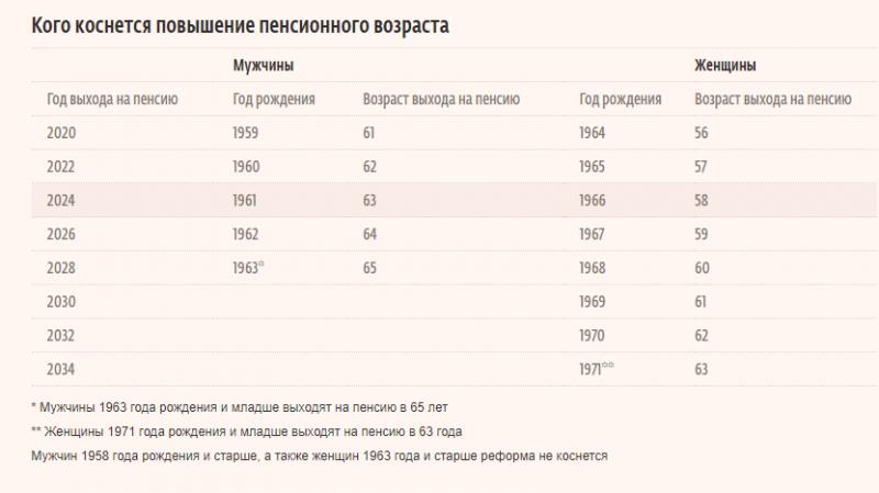 Переходный период затронет мужчин с 1959 по 1963 год рождения включительно и женщин с 1964-1971 гг. рождения. Например, родившиеся в 1959 г. мужчины смогут выйти на пенсию в 2020 г. в возрасте 61 года. Для женщин 1964 года рождения возраст выхода на пенсию составит 56 лет и наступит также в 2020 г. Шаг в два года сохранится и далее (см. таблицу). Например, в 2024 г. выйти на пенсию смогут мужчины 1961 года рождения и женщины 1966 года в возрасте 63 и 58 лет соответственно. Постепенное повышение пенсионного возраста позволит властям смягчить негативный эффект от реформы.