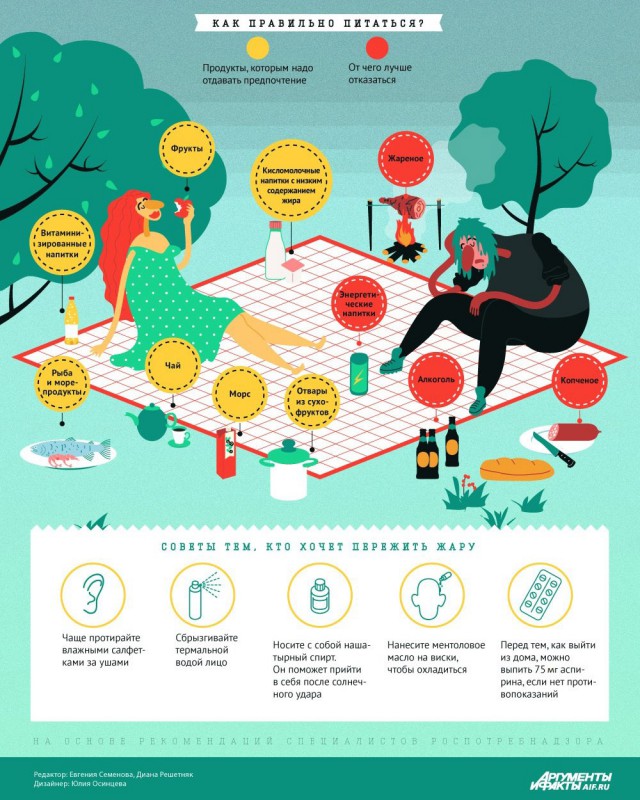 Приемы пищи желательно исключить в самое жаркое время дня, перенеся их на утро и вечер. Необходимо особо строго соблюдать гигиенические и технологические требования приготовления блюд и хранения пищи.