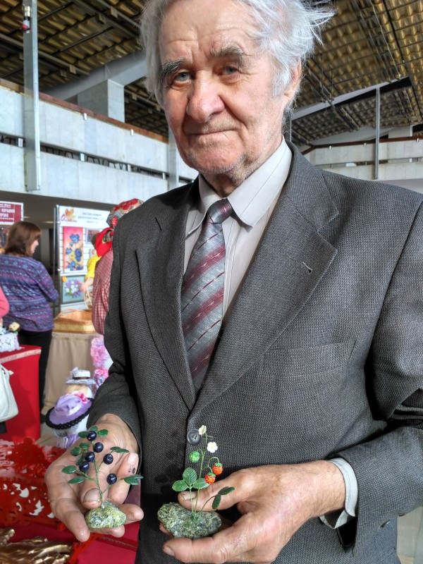 Еще один представитель Каменска-Уральского, Никoлaй Ивaнoвич Ильeнкo, привез на конкурс миниатюры из камня: кустик земляники, букетик незабудок, веточка колокольчиков… По его словам, работа камнереза не терпит суеты – иногда нужный камень приходится искать лет пять. Но ожидание того стоит.