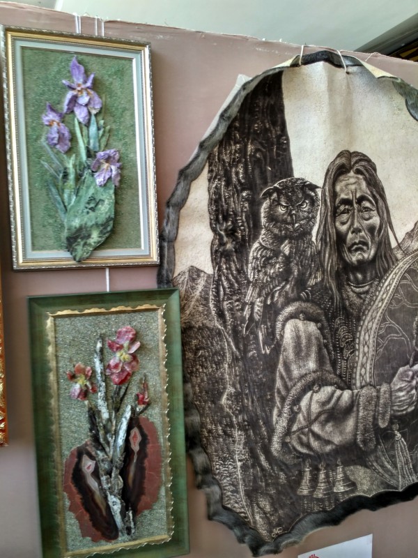 … Эти картины выделялись среди огромного многообразия экспонатов своей необычностью. Сверкающие в свете ламп фиолетово-сиреневые ирисы на изумрудном стебле, сценки из жизни народов уральского Севера… Материалы, которые использовали художники, для нашего края являются традиционными – камень, шкура зверя. Но в руках талантливых мастеров они проявляют себя каждый раз по-новому.