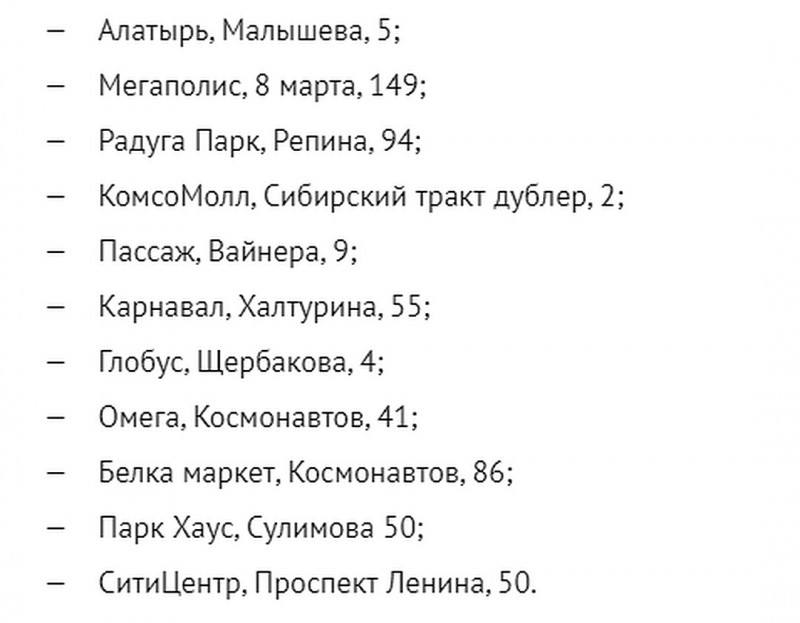 Список ТЦ, куда можно прийти: