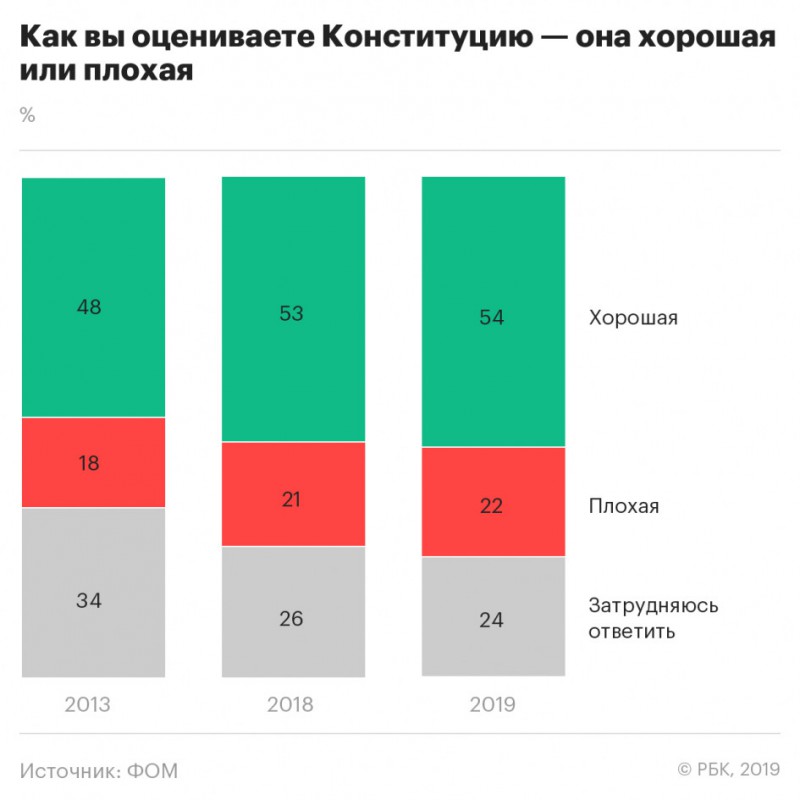 На просьбу оценить, является ли российская Конституция хорошей или плохой, 54% выбрали вариант «хорошая» (53% в 2018 году и 48% в 2013-м). «Плохим» Основной закон назвали 22% граждан (21% в прошлом году и 18% в 2013-м).