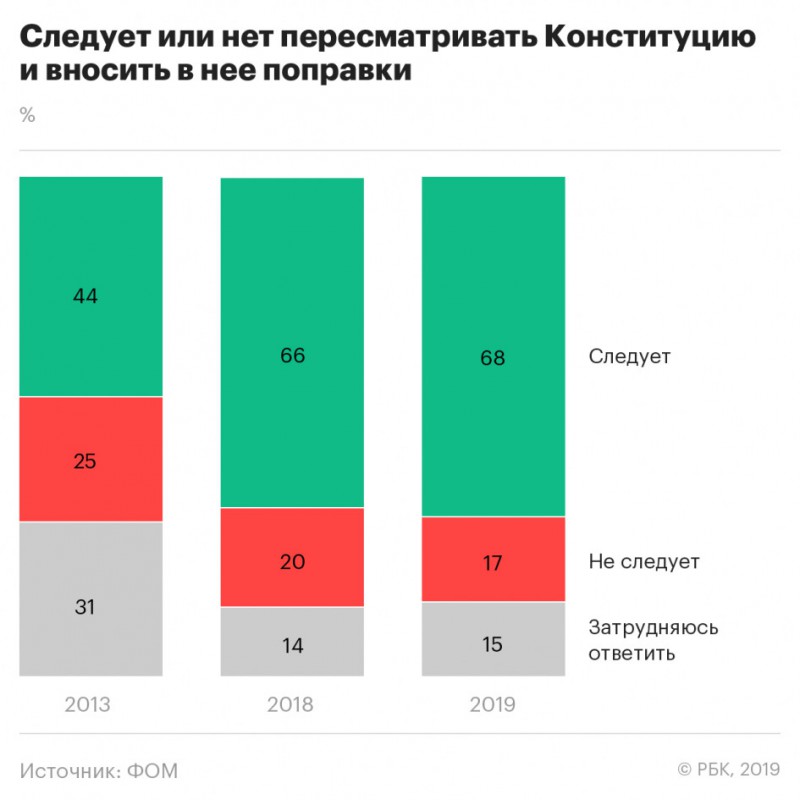 Тот факт, что с 2013 года число россиян, считающих, что следует пересмотреть Конституцию, существенно выросло, означает, по мнению Кертмана, следующее: «Бывают времена, когда стабильность дороже перемен, и наоборот. Сейчас запрос на перемены выражен сильнее, чем запрос на стабильность. И когда люди говорят об изменении Конституции, это может быть отражением их установок на изменения».