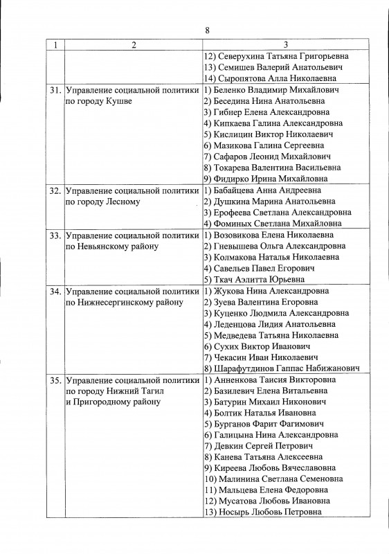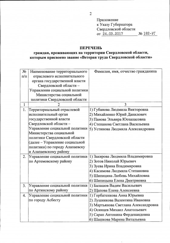 В соответствии с Законом Свердловской области от 23 декабря 2010 года № 104-03 «О ветеранах труда Свердловской области», рассмотрев списки лиц, претендующих на присвоение звания «Ветеран труда Свердловской области», представленные территориальными отраслевыми исполнительными органами государственной власти Свердловской области – управлениями социальной политики Министерства социальной политики Свердловской области, ПОСТАНОВЛЯЮ: