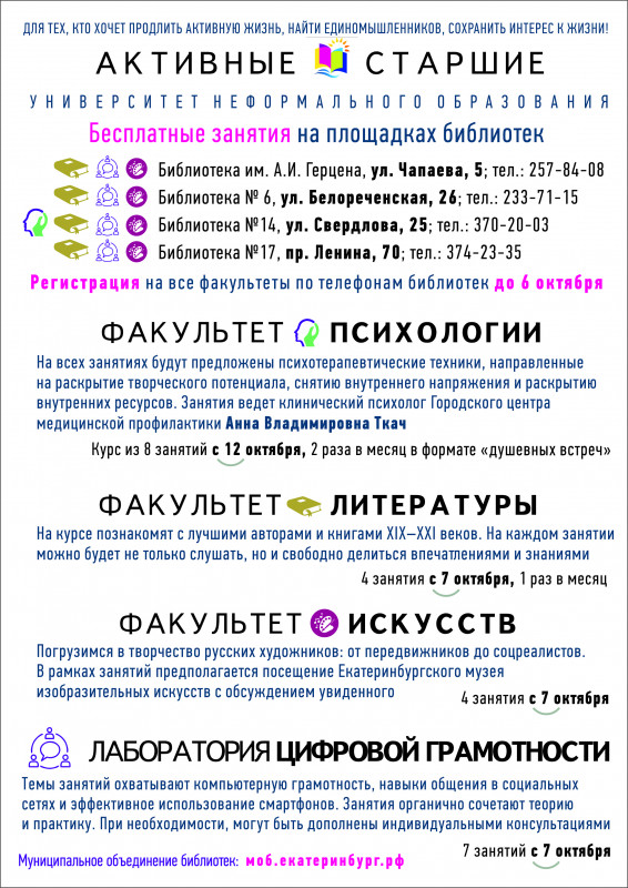 В Муниципальном объединении библиотек города Екатеринбурга откроется университет неформального образования «Активные старшие». Этот проект адресован горожанам серебряного возраста, которые хотят жить насыщенной жизнью, узнавать новое и находить друзей.