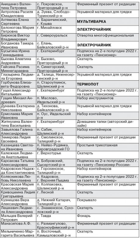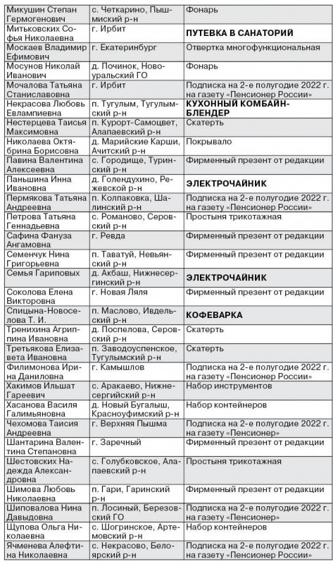 Еще раз поздравляю всех, кто нашел свою фамилию в сегодняшнем списке! Пусть эта удача поднимет вам настроение. А те, кто не нашел свою фамилию, не огорчайтесь, ведь с вами остается ваш друг «Пенсионер», которого ждут каждую неделю, который подскажет, научит, с которым можно поделиться радостями и горестями.