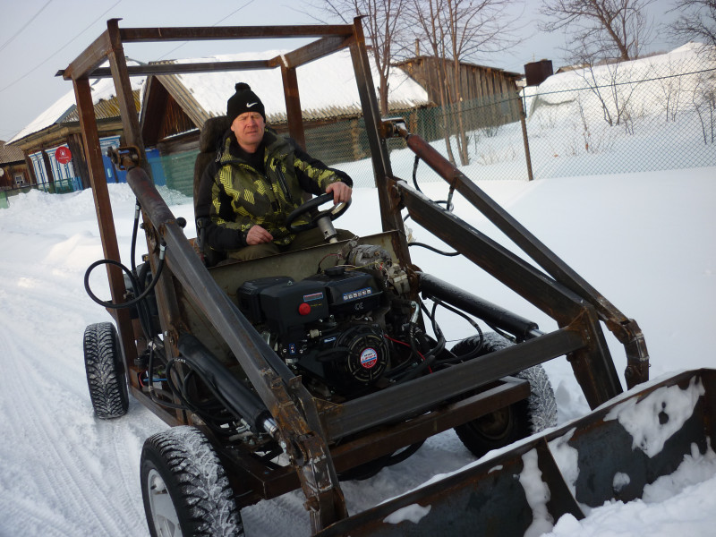 Потом Александр Павлович открыл ворота гаража и выкатил оттуда другое самодельное чудо – погрузчик. Тут же продемонстрировал, как он работает, набрав ковшом снег на улице и вывалив его подальше от проезжей части. Работа над погрузчиком будет продолжена весной: умелец хочет сделать теплую кабину. А применение агрегату найдется и летом: на нем можно вывозить пчелиные ульи в поле, где много разнотравья. Пчеловодством он занимается уже более 25 лет, у него 20 пчелиных «домиков».