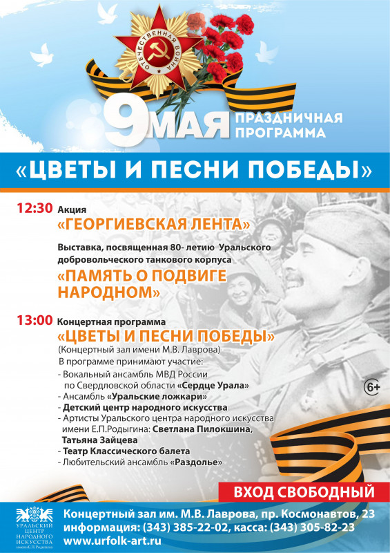 Перед концертом зрители смогут познакомиться с экспонатами выставки «Память о подвиге народном», посвященной 80-летию Уральского добровольческого танкового корпуса и принять участие в акции «Георгиевская лента»
