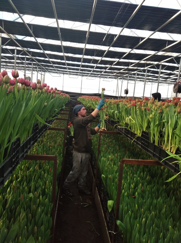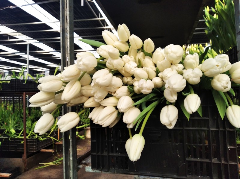 Затем ящики с цветами несут на сортировку. Луковицы оделяют от стеблей, выравнивают цветы по длине, упаковывают в коробки и отправляют в холодильник. Температуру от 0 до + 2 градусов тюльпаны переносят комфортно, потому что в коробке они сами себя греют. Так цветы могут хранится полторы-две недели. С 25 февраля начинается отгрузка. Основные клиентыарамашевских цветоводов - оптовые базы. Они перепродают тюльпаны флористам, а делают букеты и продают конечному потребителю.