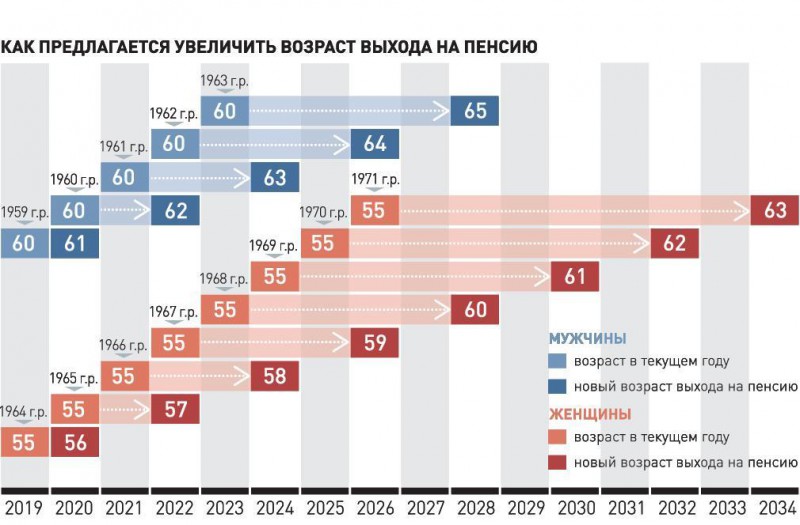 Начать правительство предлагает уже с 1 января 2019 года, при этом предусматривается достаточно длительный переходный период: с 2019 по 2028 год для мужчин и 2019 по 2034 год для женщин. Таким образом, возраст выхода на пенсию предлагается увеличивать по принципу "на год за год пропуская год" в течение 10 лет для мужчин и 16 лет для женщин. (См. инфографику выше)
